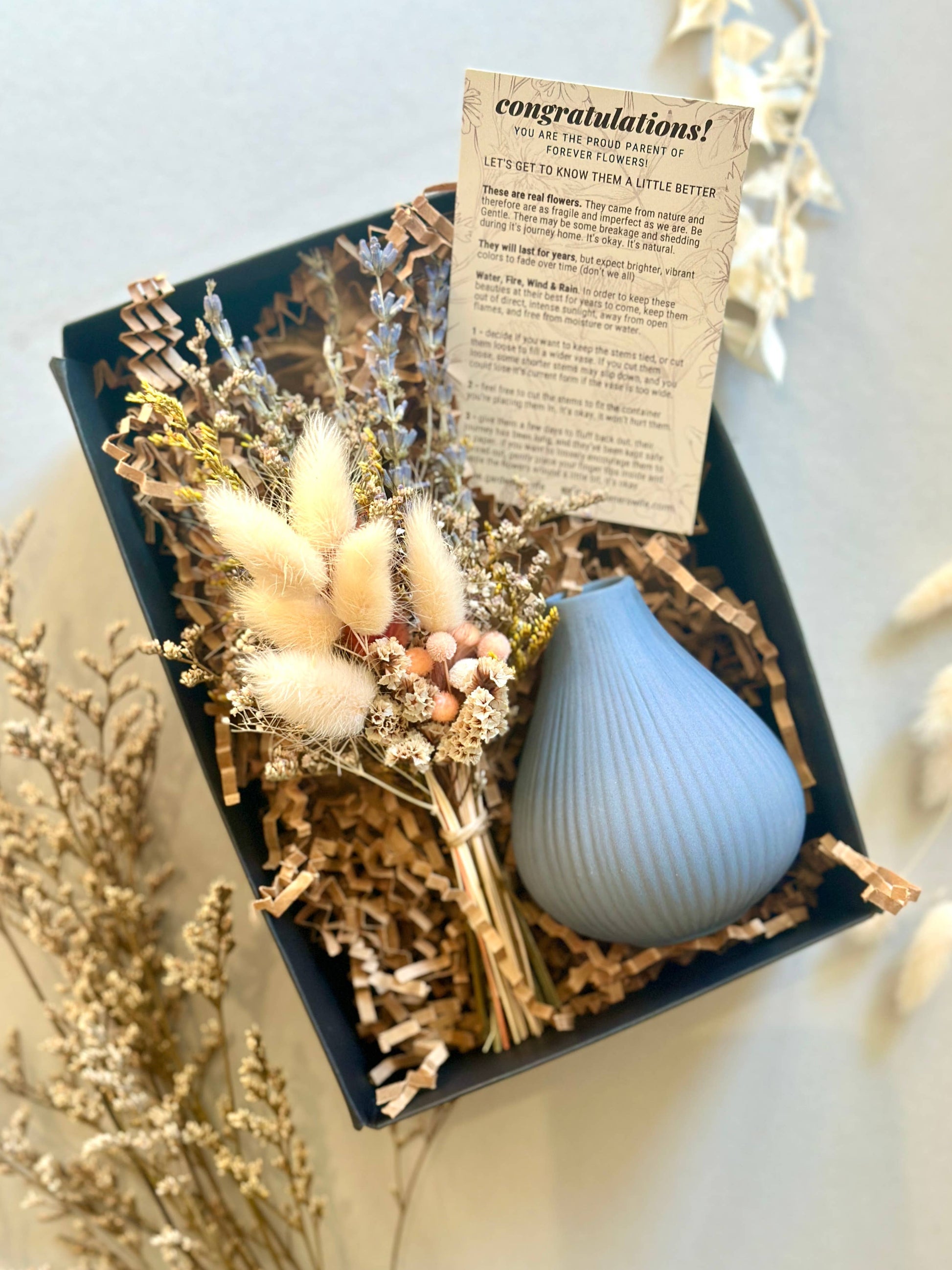 This gift set makes gift-giving even easier with its stylish kraft box and adorable little vase. Flower lovers rejoice because these are forever flowers! Forever flowers are real flowers that have been dried and preserved, yielding a beautiful bouquet that lasts forever.