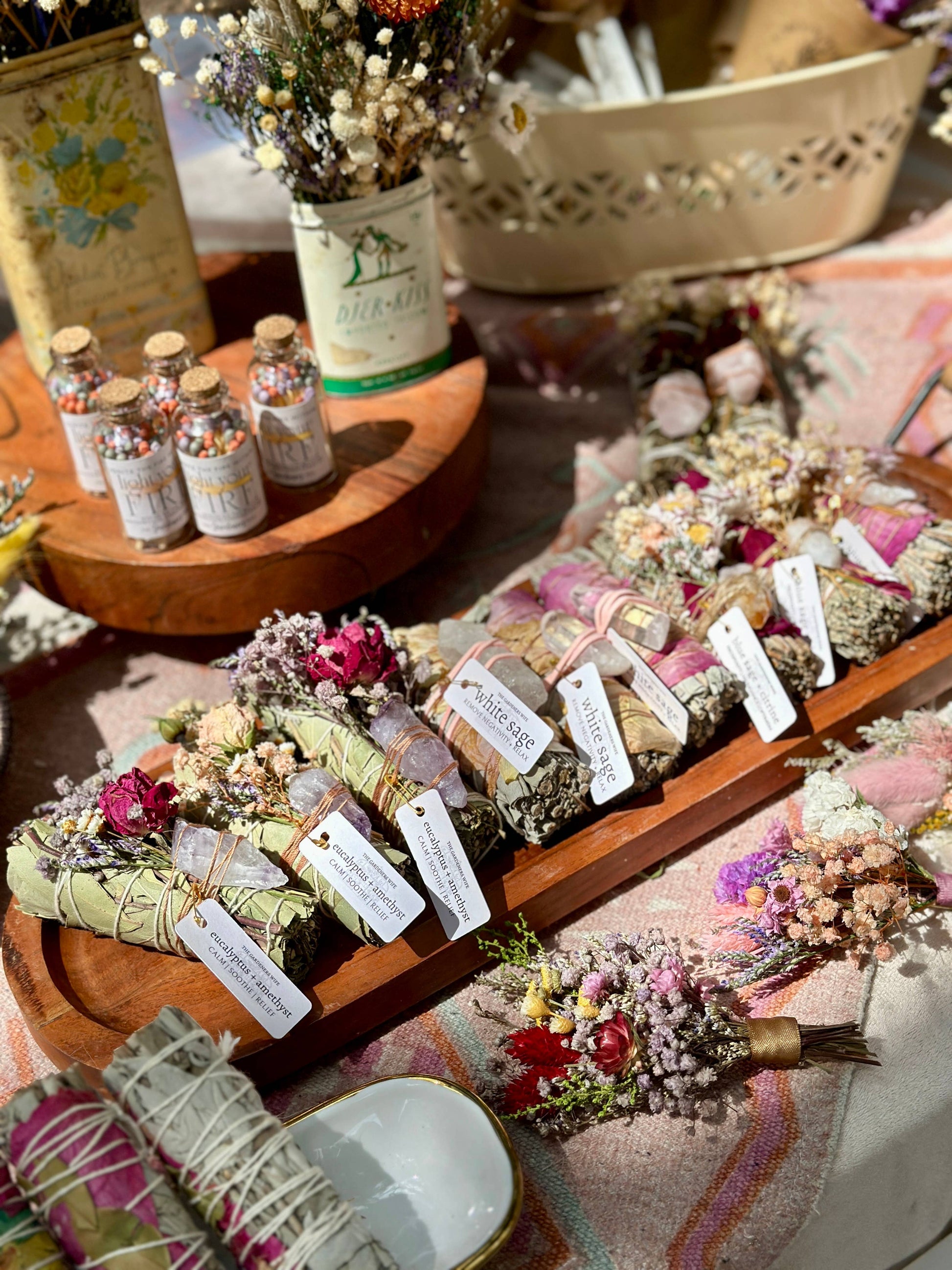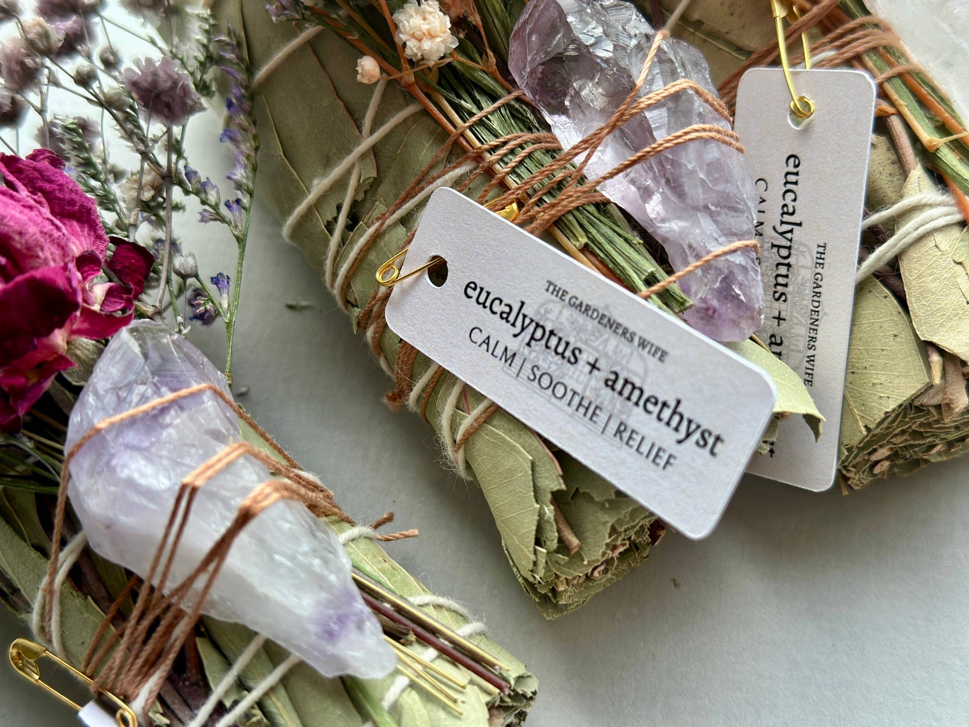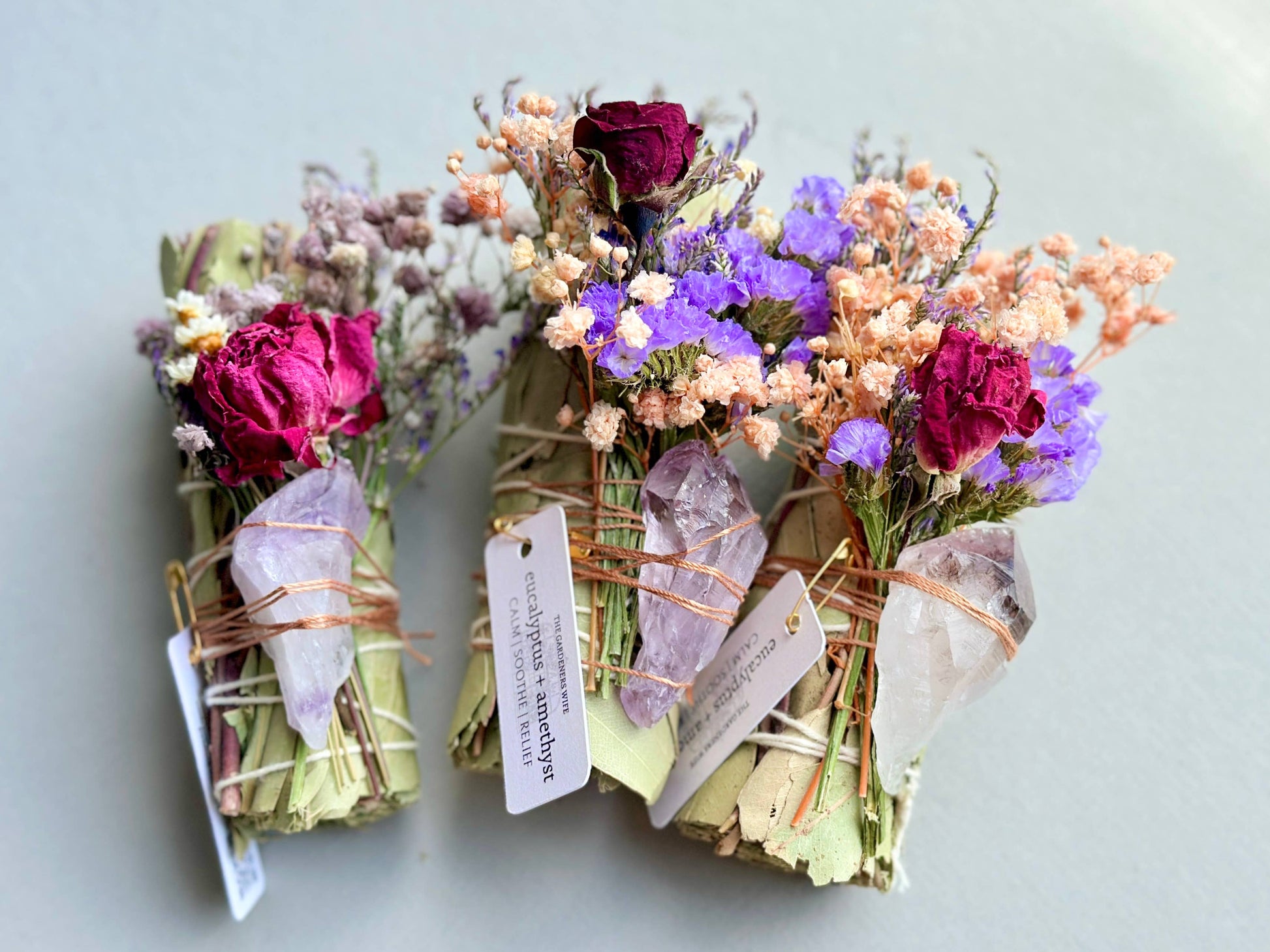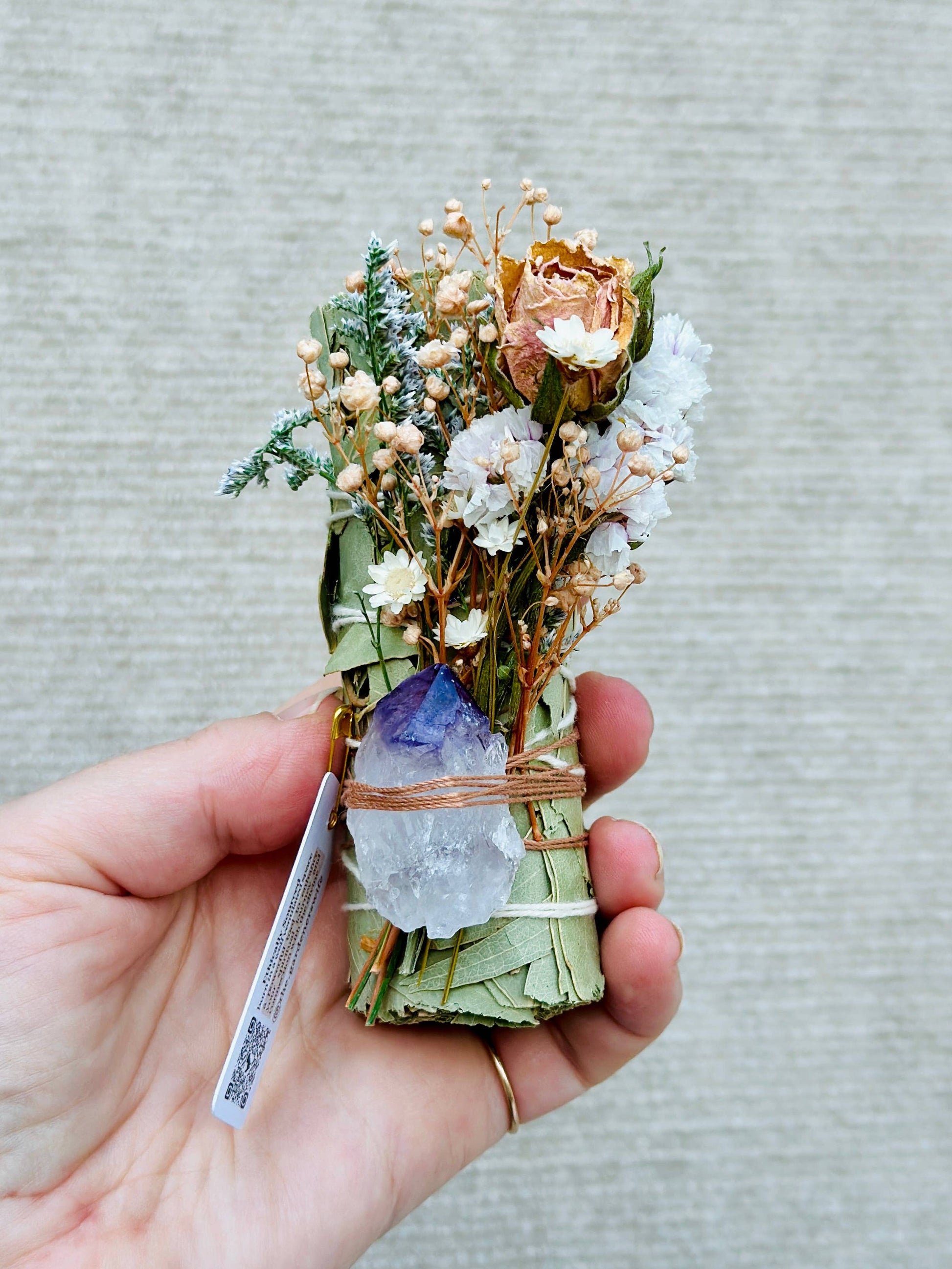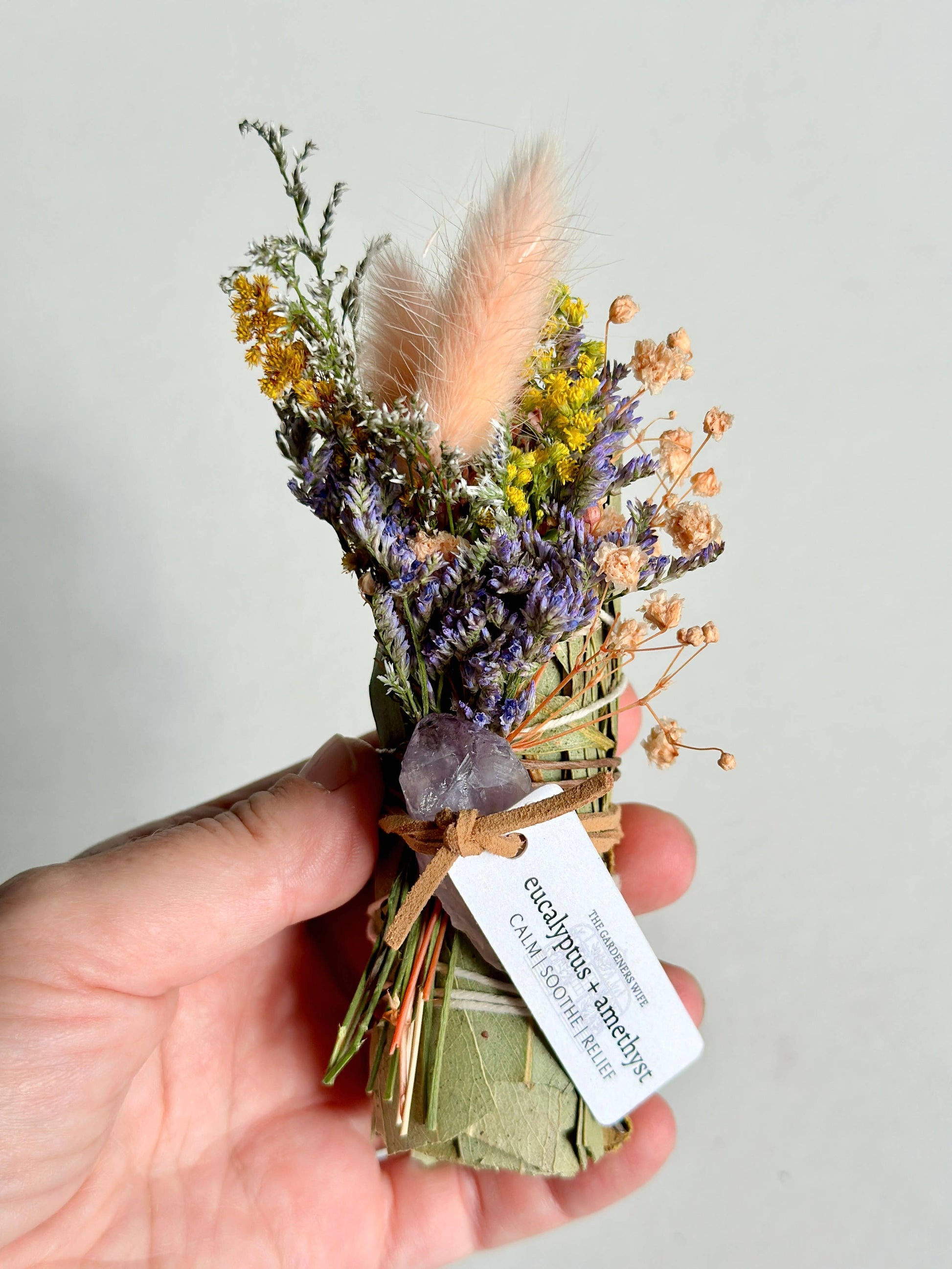 Each wand is hand assembled with ethically sourced eucalyptus, in recognition of where this origin began. Fresh flowers are then dried and tied to the wand, and an amethyst crystal finishes each bundle off. The crystal comes off, but the flowers can remain tied on and burned.