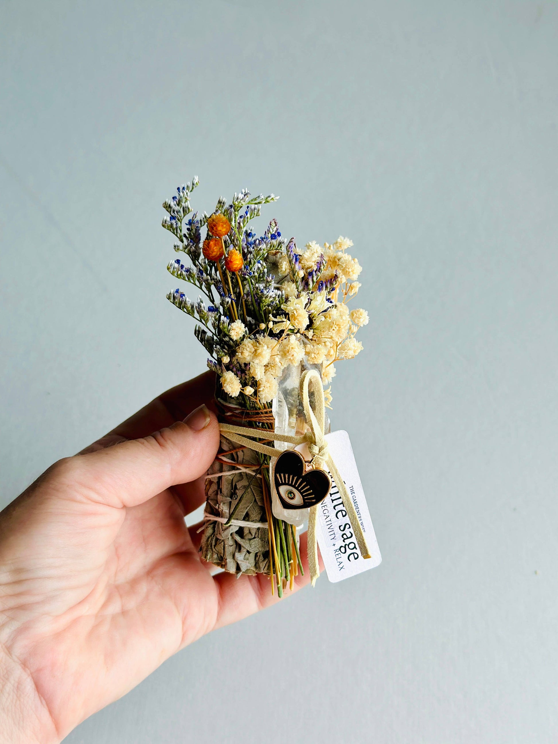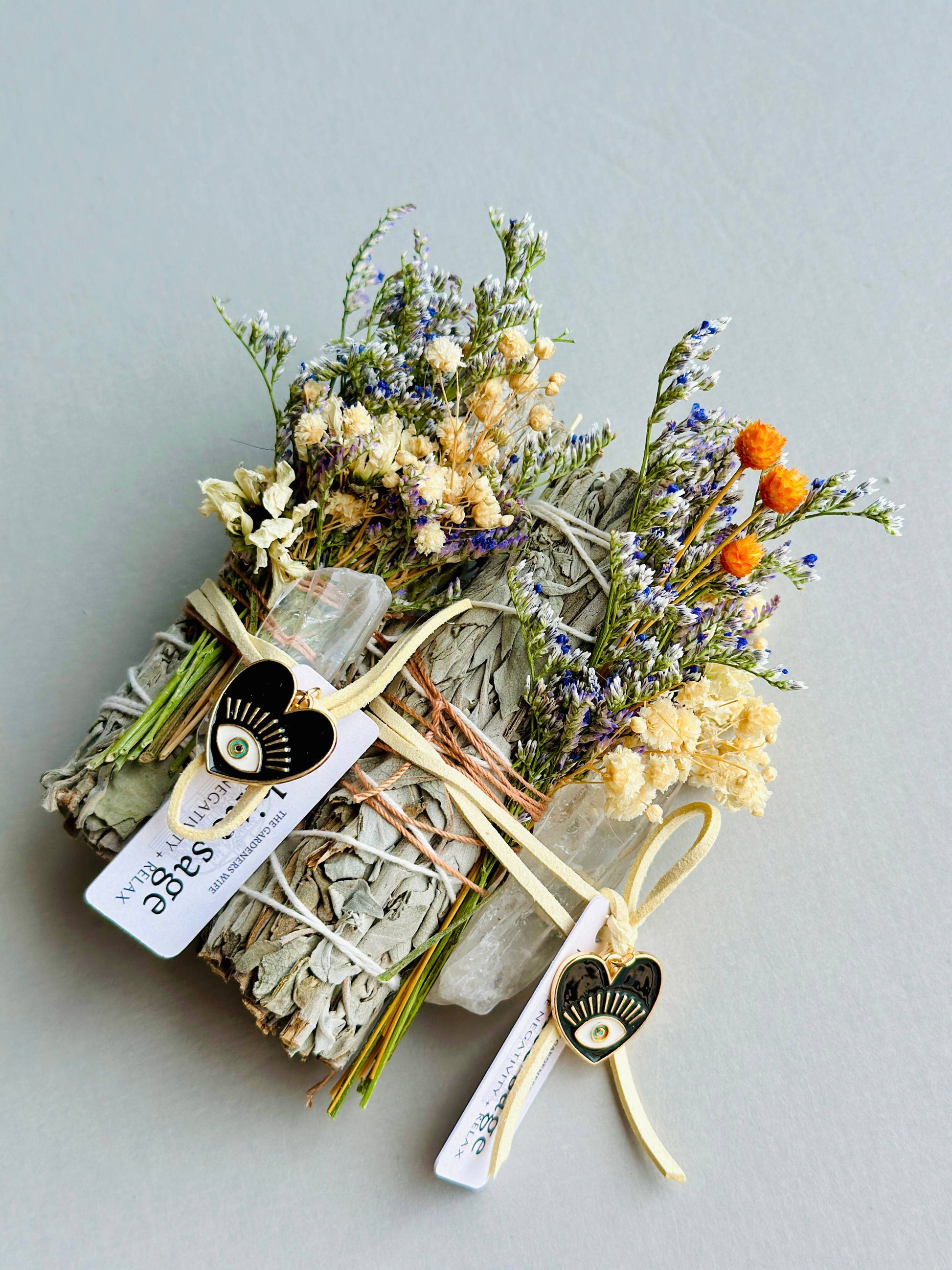 This bundle is to bring all the good vibes: white sage, seasonal florals, clear quartz and evil eye charm. White Sage is one of four sacred herbs used by Native Americans for healing rituals. I pay respect to this sacred tradition by donating $1 from every bundle sold to the Native American Rights Foundation (narf.org) White sage is known to create a calming space when burned. When you burn white sage you should do so with your intentions set on what you wish to bring in and what you wish to get rid of. It's also a natural insect repellent! Sage wands are 4" long, wrapped with seasonal flowers, a clear quartz point and tied off with leatherette cord and evil eye charm.